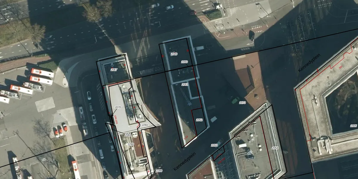 Het perceel waarop Kennedyplein 4 staat heeft een oppervlakte van 551 m². Dit is een groot perceel. De perceeloppervlakte wordt geregistreerd door het Kadaster. Gedetailleerde informatie over de maten van dit perceel kunt u vinden in het rapport Kadastrale kaart met maatvoering van Kennedyplein 4.