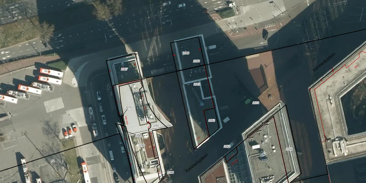 Het perceel waarop Kennedyplein 8 staat heeft een oppervlakte van 551 m². Dit is een groot perceel. De perceeloppervlakte wordt geregistreerd door het Kadaster. Gedetailleerde informatie over de maten van dit perceel kunt u vinden in het rapport Kadastrale kaart met maatvoering van Kennedyplein 8.