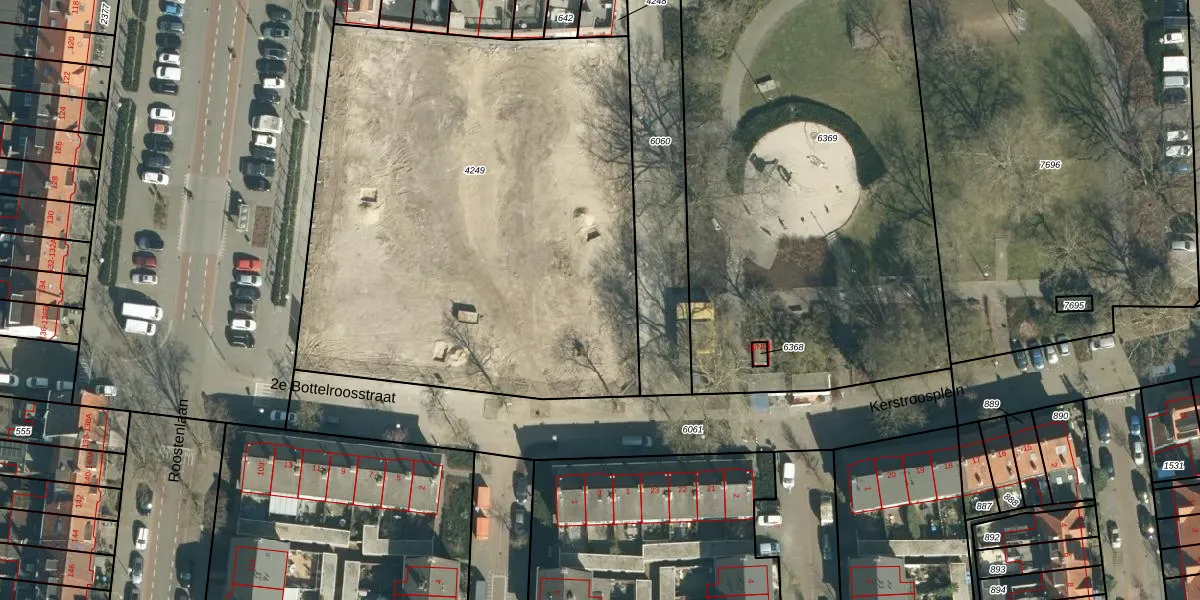 Het perceel waarop Kerstroosplein 25-B staat heeft een oppervlakte van 3172 m². Dit is een zeer groot perceel. De perceeloppervlakte wordt geregistreerd door het Kadaster. Gedetailleerde informatie over de maten van dit perceel kunt u vinden in het rapport Kadastrale kaart met maatvoering van Kerstroosplein 25-B.