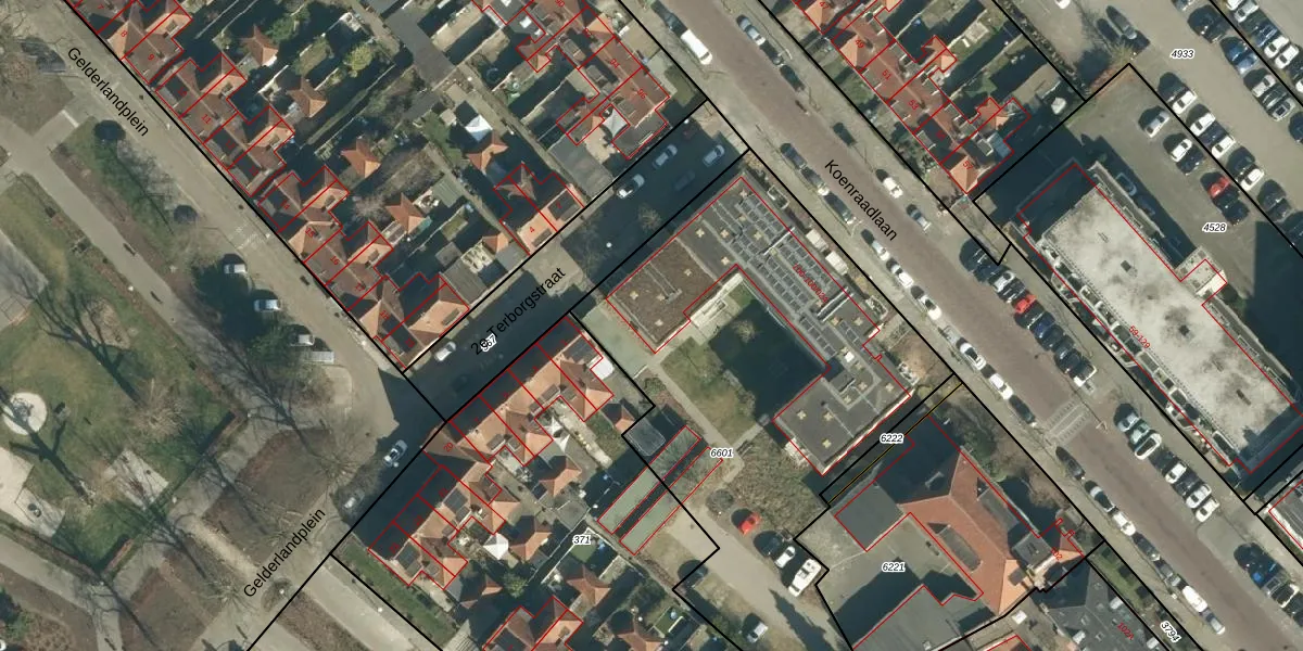 Koenraadlaan 100 is gelegen op kadastraal perceel STR03C6601. Deze kadastrale aanduiding is uniek en wordt gebruikt door het Kadaster om eigendomsrechten en andere zakelijke rechten vast te leggen. Het perceel maakt onderdeel uit van de kadastrale gemeente Strijp.