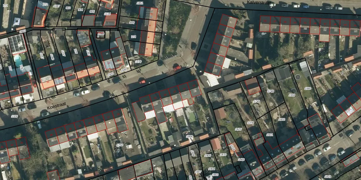 Het perceel waarop Koestraat 15 staat heeft een oppervlakte van 1,3 ha. Dit is een zeer groot perceel. De perceeloppervlakte wordt geregistreerd door het Kadaster. Gedetailleerde informatie over de maten van dit perceel kunt u vinden in het rapport Kadastrale kaart met maatvoering van Koestraat 15.