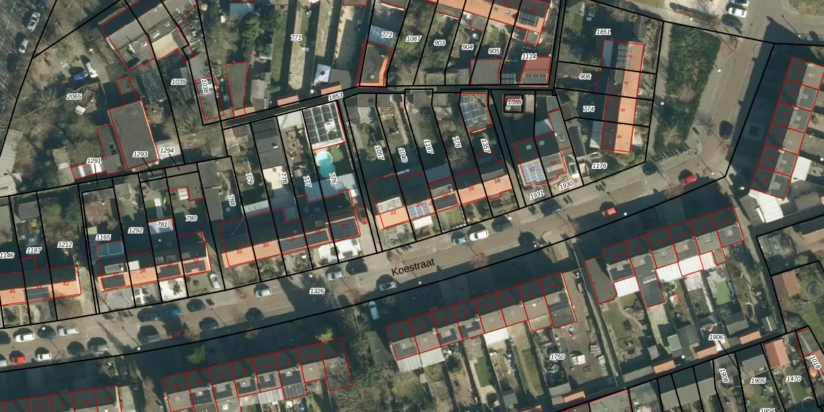Het perceel waarop Koestraat 20 staat heeft een oppervlakte van 254 m². Dit is een middelgroot perceel. De perceeloppervlakte wordt geregistreerd door het Kadaster. Gedetailleerde informatie over de maten van dit perceel kunt u vinden in het rapport Kadastrale kaart met maatvoering van Koestraat 20.