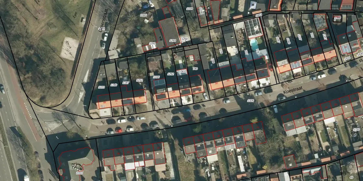 Het perceel waarop Koestraat 36 staat heeft een oppervlakte van 196 m². Dit is een middelgroot perceel. De perceeloppervlakte wordt geregistreerd door het Kadaster. Gedetailleerde informatie over de maten van dit perceel kunt u vinden in het rapport Kadastrale kaart met maatvoering van Koestraat 36.
