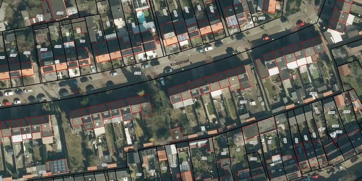 Het perceel waarop Koestraat 37 staat heeft een oppervlakte van 1,3 ha. Dit is een zeer groot perceel. De perceeloppervlakte wordt geregistreerd door het Kadaster. Gedetailleerde informatie over de maten van dit perceel kunt u vinden in het rapport Kadastrale kaart met maatvoering van Koestraat 37.