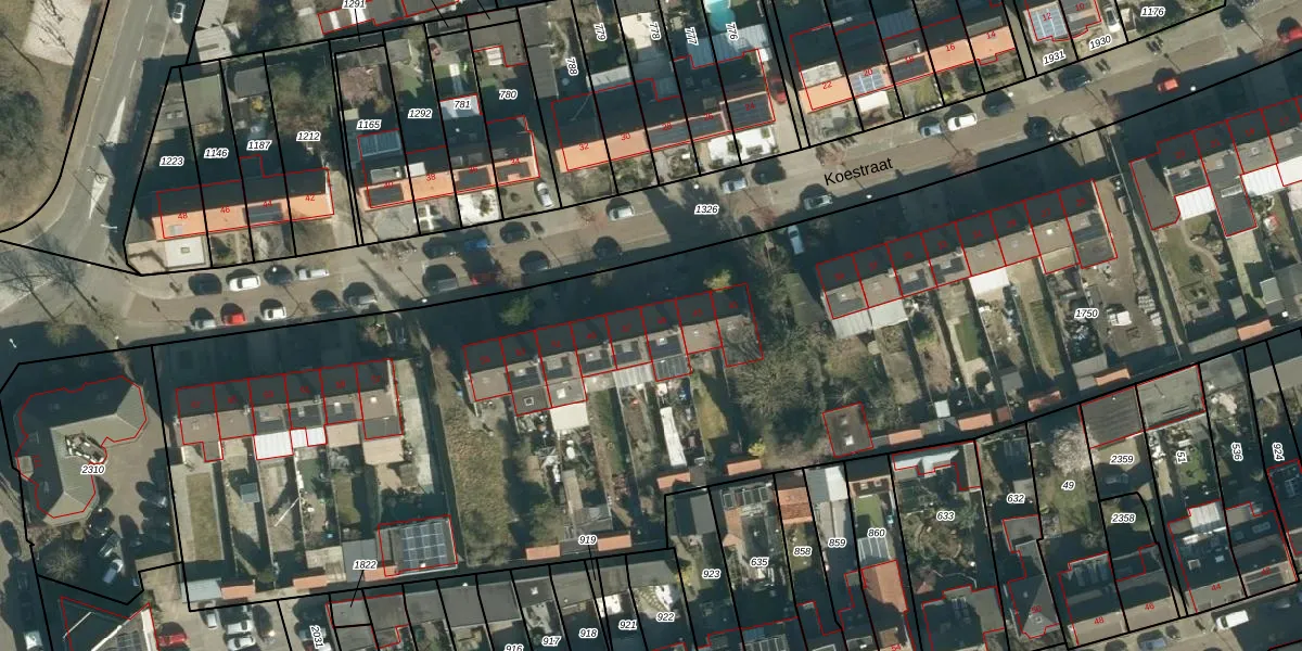 Het perceel waarop Koestraat 45 staat heeft een oppervlakte van 1,3 ha. Dit is een zeer groot perceel. De perceeloppervlakte wordt geregistreerd door het Kadaster. Gedetailleerde informatie over de maten van dit perceel kunt u vinden in het rapport Kadastrale kaart met maatvoering van Koestraat 45.