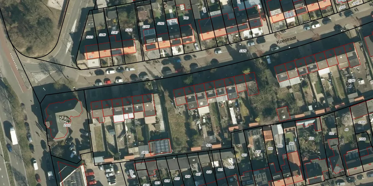 Het perceel waarop Koestraat 53 staat heeft een oppervlakte van 1,3 ha. Dit is een zeer groot perceel. De perceeloppervlakte wordt geregistreerd door het Kadaster. Gedetailleerde informatie over de maten van dit perceel kunt u vinden in het rapport Kadastrale kaart met maatvoering van Koestraat 53.