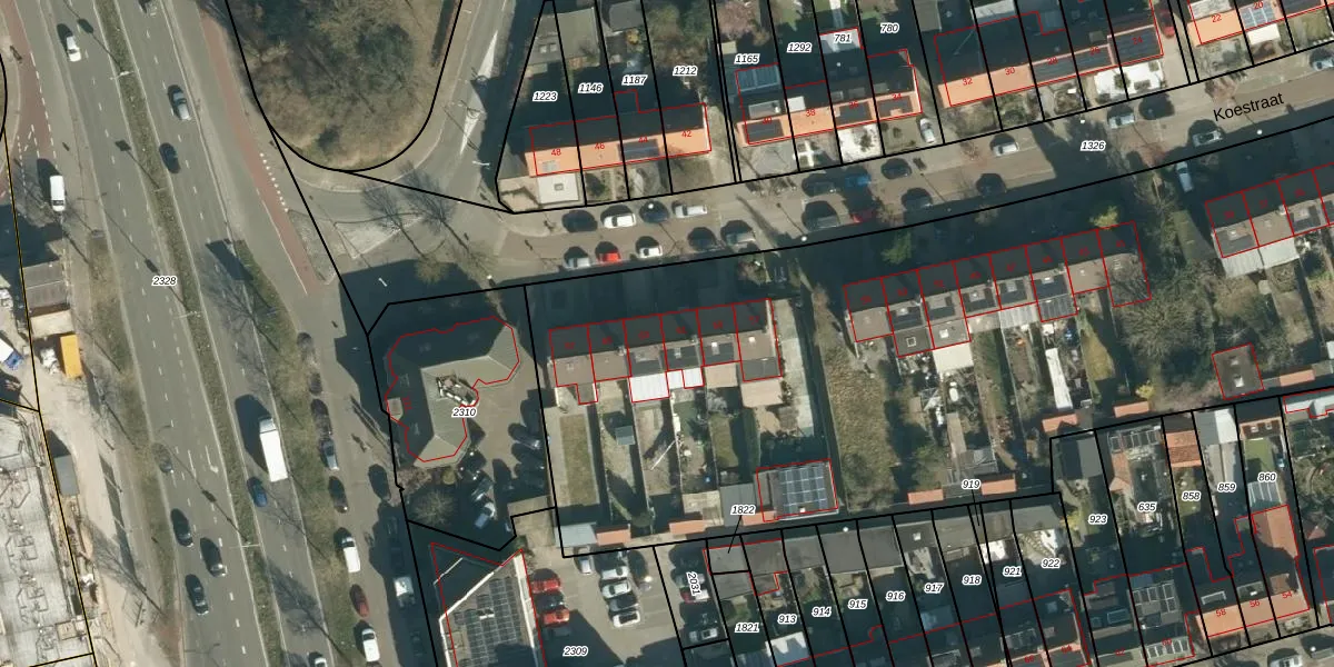 Het perceel waarop Koestraat 61 staat heeft een oppervlakte van 1,3 ha. Dit is een zeer groot perceel. De perceeloppervlakte wordt geregistreerd door het Kadaster. Gedetailleerde informatie over de maten van dit perceel kunt u vinden in het rapport Kadastrale kaart met maatvoering van Koestraat 61.