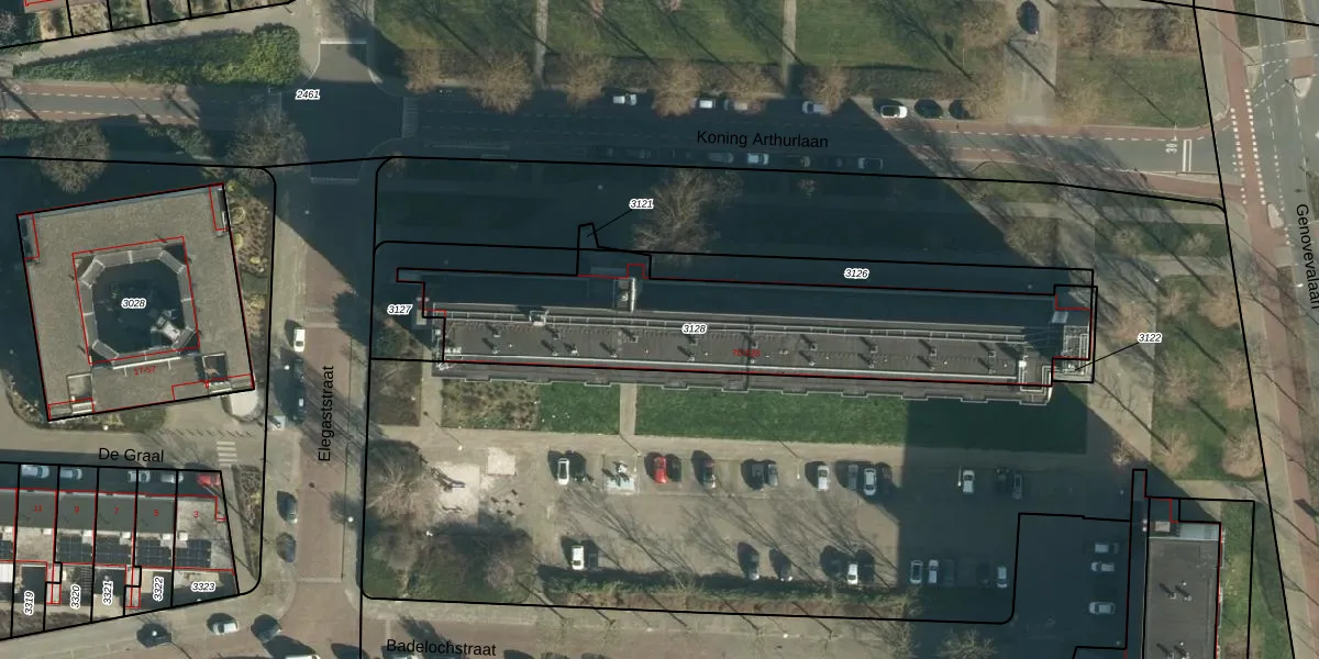 Het perceel waarop Koning Arthurlaan 176 staat heeft een oppervlakte van 1419 m². Dit is een zeer groot perceel. De perceeloppervlakte wordt geregistreerd door het Kadaster. Gedetailleerde informatie over de maten van dit perceel kunt u vinden in het rapport Kadastrale kaart met maatvoering van Koning Arthurlaan 176.