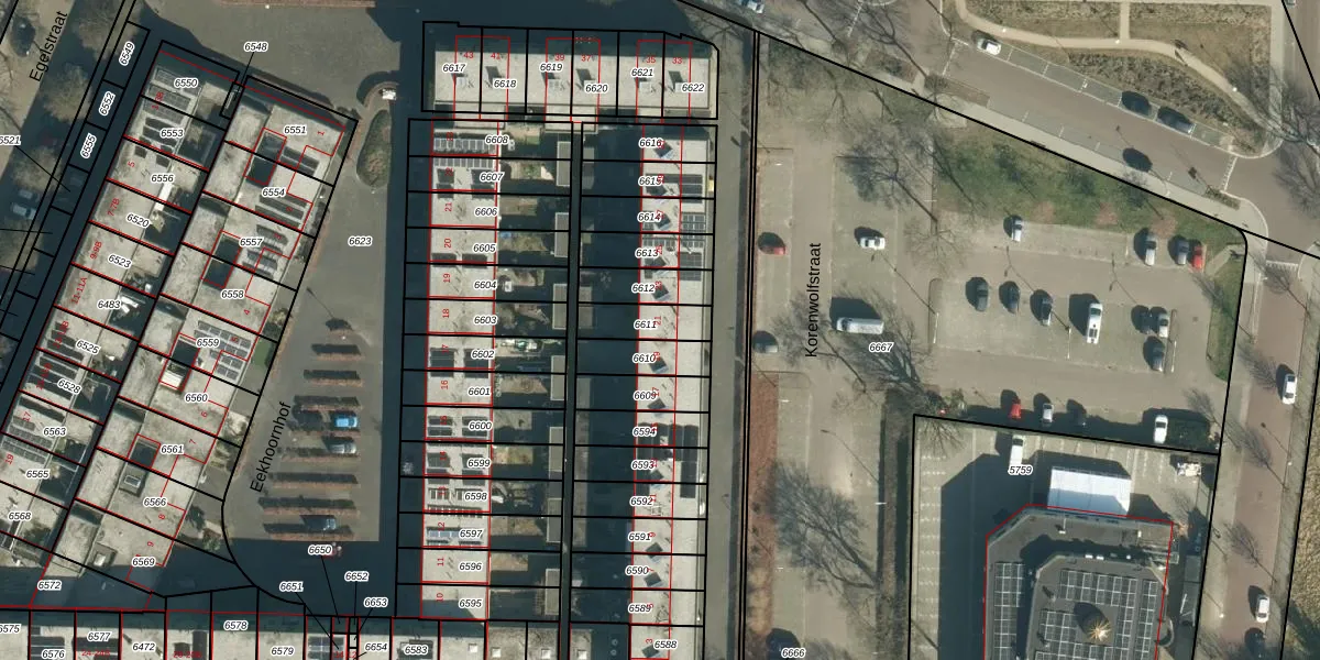 Korenwolfstraat 21 is gelegen op kadastraal perceel WSL01G6611. Deze kadastrale aanduiding is uniek en wordt gebruikt door het Kadaster om eigendomsrechten en andere zakelijke rechten vast te leggen. Het perceel maakt onderdeel uit van de kadastrale gemeente Woensel.