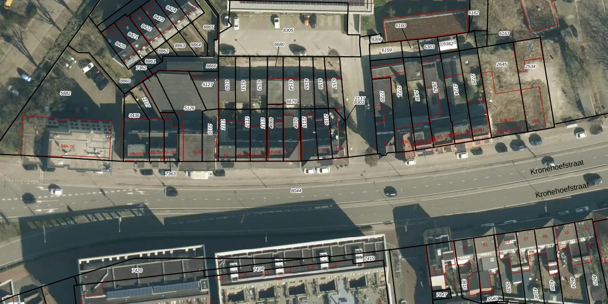 Het perceel waarop Kronehoefstraat 40 staat heeft een oppervlakte van 88 m². Dit is een klein perceel. De perceeloppervlakte wordt geregistreerd door het Kadaster. Gedetailleerde informatie over de maten van dit perceel kunt u vinden in het rapport Kadastrale kaart met maatvoering van Kronehoefstraat 40.