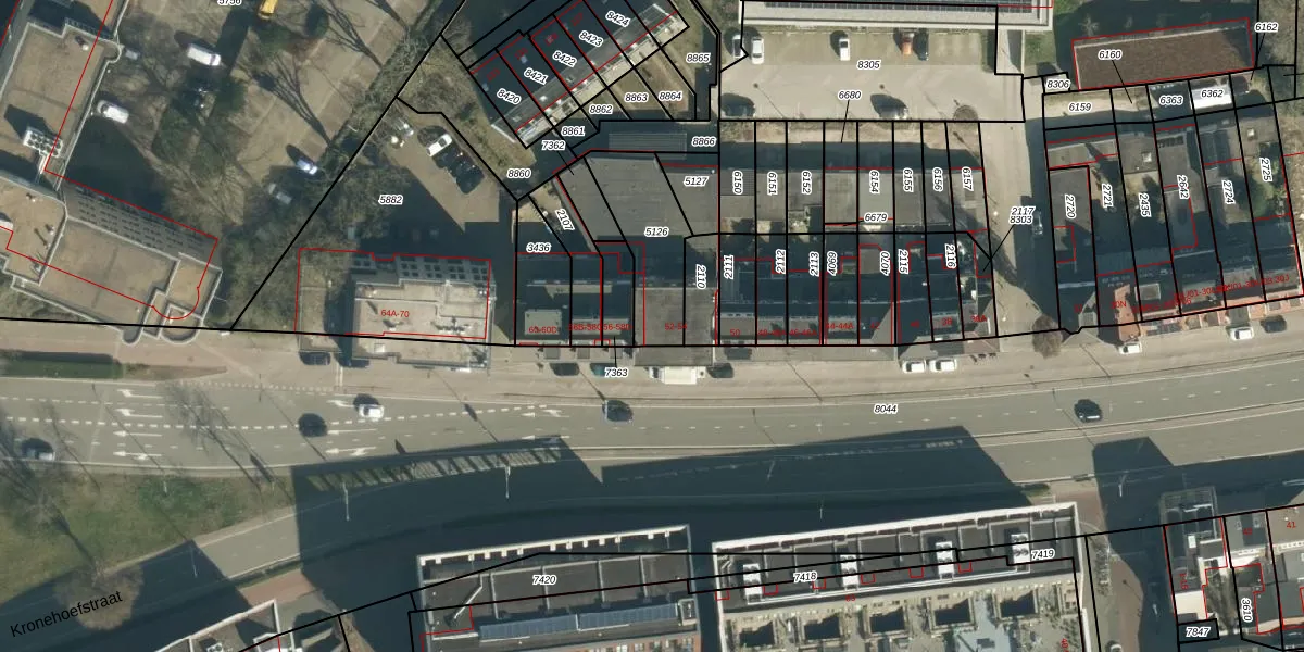 Kronehoefstraat 54 is gelegen op kadastraal perceel WSL01G5126. Deze kadastrale aanduiding is uniek en wordt gebruikt door het Kadaster om eigendomsrechten en andere zakelijke rechten vast te leggen. Het perceel maakt onderdeel uit van de kadastrale gemeente Woensel.