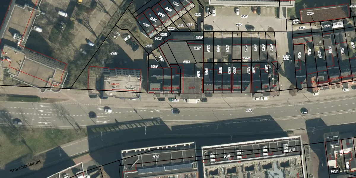 Het perceel waarop Kronehoefstraat 56 staat heeft een oppervlakte van 80 m². Dit is een klein perceel. De perceeloppervlakte wordt geregistreerd door het Kadaster. Gedetailleerde informatie over de maten van dit perceel kunt u vinden in het rapport Kadastrale kaart met maatvoering van Kronehoefstraat 56.
