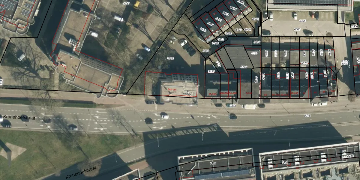 Kronehoefstraat 64-A is gelegen op kadastraal perceel WSL01G5882. Deze kadastrale aanduiding is uniek en wordt gebruikt door het Kadaster om eigendomsrechten en andere zakelijke rechten vast te leggen. Het perceel maakt onderdeel uit van de kadastrale gemeente Woensel.