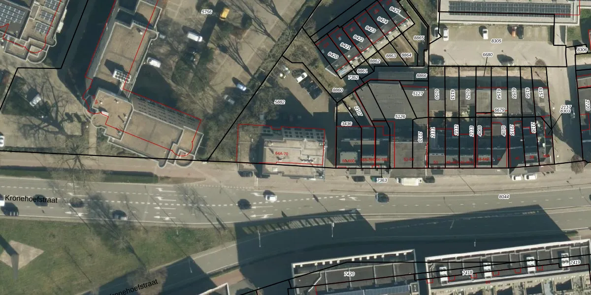 Kronehoefstraat 64-B is gelegen op kadastraal perceel WSL01G5882. Deze kadastrale aanduiding is uniek en wordt gebruikt door het Kadaster om eigendomsrechten en andere zakelijke rechten vast te leggen. Het perceel maakt onderdeel uit van de kadastrale gemeente Woensel.