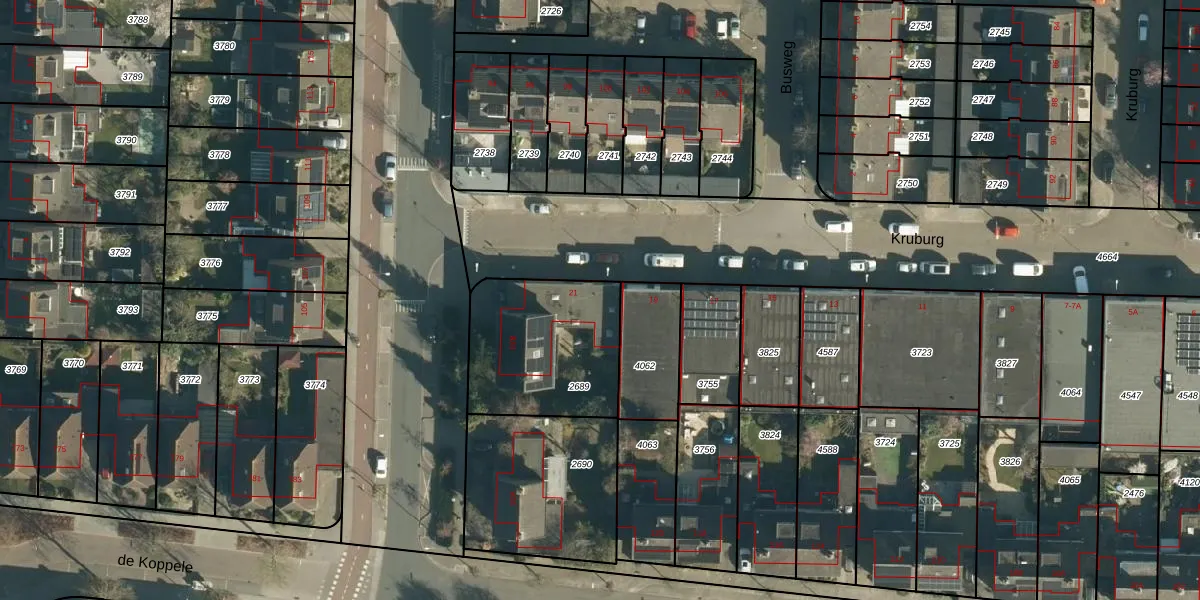Het perceel waarop Kruburg 21 staat heeft een oppervlakte van 563 m². Dit is een groot perceel. De perceeloppervlakte wordt geregistreerd door het Kadaster. Gedetailleerde informatie over de maten van dit perceel kunt u vinden in het rapport Kadastrale kaart met maatvoering van Kruburg 21.