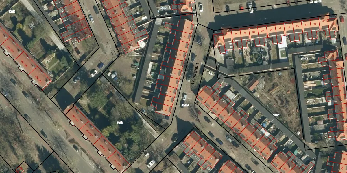 Lamastraat 7 is gelegen op kadastraal perceel STM00F2294. Deze kadastrale aanduiding is uniek en wordt gebruikt door het Kadaster om eigendomsrechten en andere zakelijke rechten vast te leggen. Het perceel maakt onderdeel uit van de kadastrale gemeente Stratum.