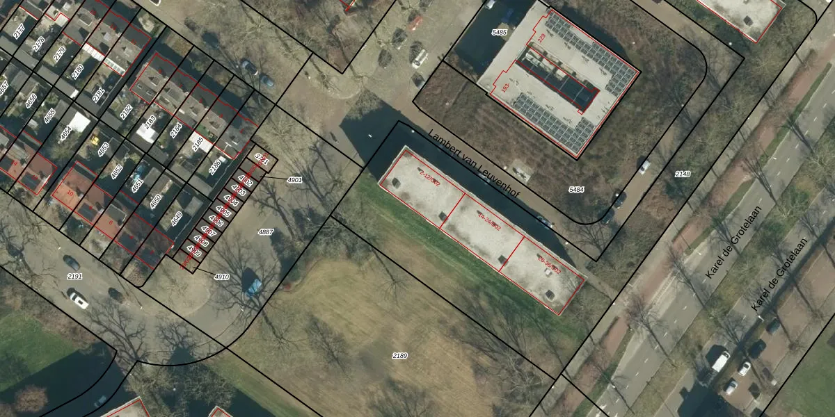 Het perceel waarop Lambert van Leuvenhof 12 staat heeft een oppervlakte van 3731 m². Dit is een zeer groot perceel. De perceeloppervlakte wordt geregistreerd door het Kadaster. Gedetailleerde informatie over de maten van dit perceel kunt u vinden in het rapport Kadastrale kaart met maatvoering van Lambert van Leuvenhof 12.