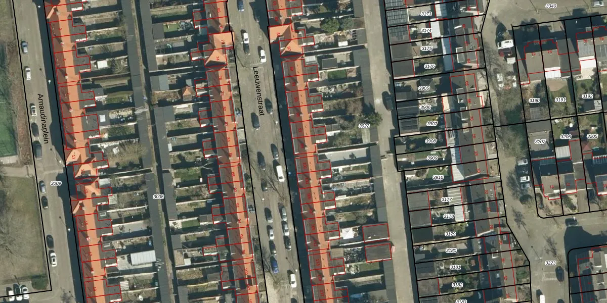 Het perceel waarop Leeuwenstraat 99 staat heeft een oppervlakte van 7359 m². Dit is een zeer groot perceel. De perceeloppervlakte wordt geregistreerd door het Kadaster. Gedetailleerde informatie over de maten van dit perceel kunt u vinden in het rapport Kadastrale kaart met maatvoering van Leeuwenstraat 99.