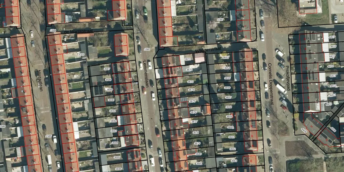 Gebruik de zoekbalk of klik op een perceel voor informatie over de adressen binnen dit perceel.