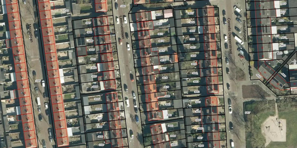 Gebruik de zoekbalk of klik op een perceel voor informatie over de adressen binnen dit perceel.