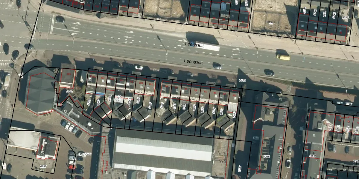 Leostraat 97 is gelegen op kadastraal perceel STM00D6767. Deze kadastrale aanduiding is uniek en wordt gebruikt door het Kadaster om eigendomsrechten en andere zakelijke rechten vast te leggen. Het perceel maakt onderdeel uit van de kadastrale gemeente Stratum.