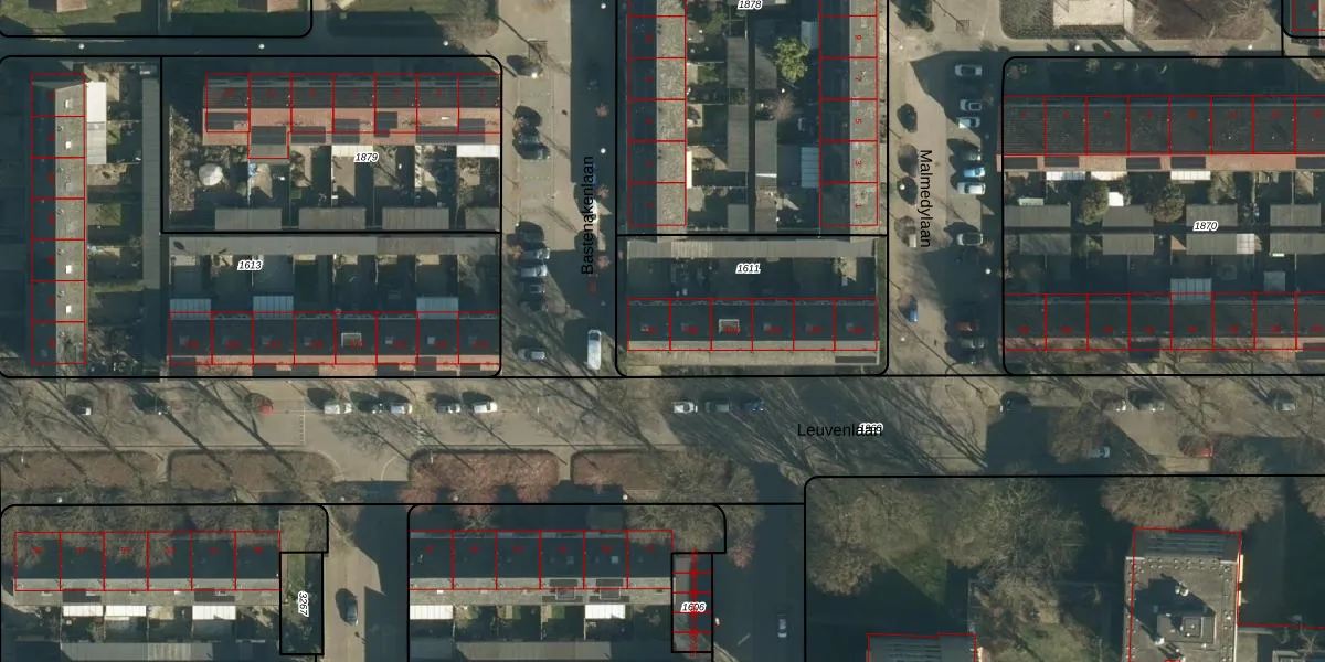 Leuvenlaan 110 is gelegen op kadastraal perceel WSL01M1611. Deze kadastrale aanduiding is uniek en wordt gebruikt door het Kadaster om eigendomsrechten en andere zakelijke rechten vast te leggen. Het perceel maakt onderdeel uit van de kadastrale gemeente Woensel.