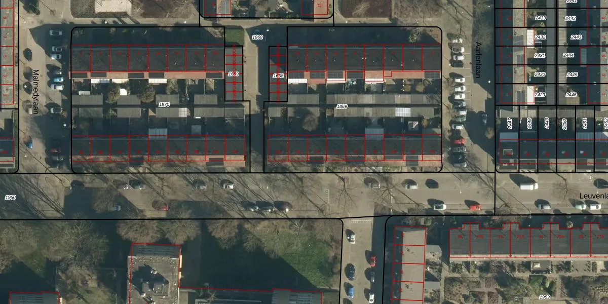 Het perceel waarop Leuvenlaan 78 staat heeft een oppervlakte van 2617 m². Dit is een zeer groot perceel. De perceeloppervlakte wordt geregistreerd door het Kadaster. Gedetailleerde informatie over de maten van dit perceel kunt u vinden in het rapport Kadastrale kaart met maatvoering van Leuvenlaan 78.