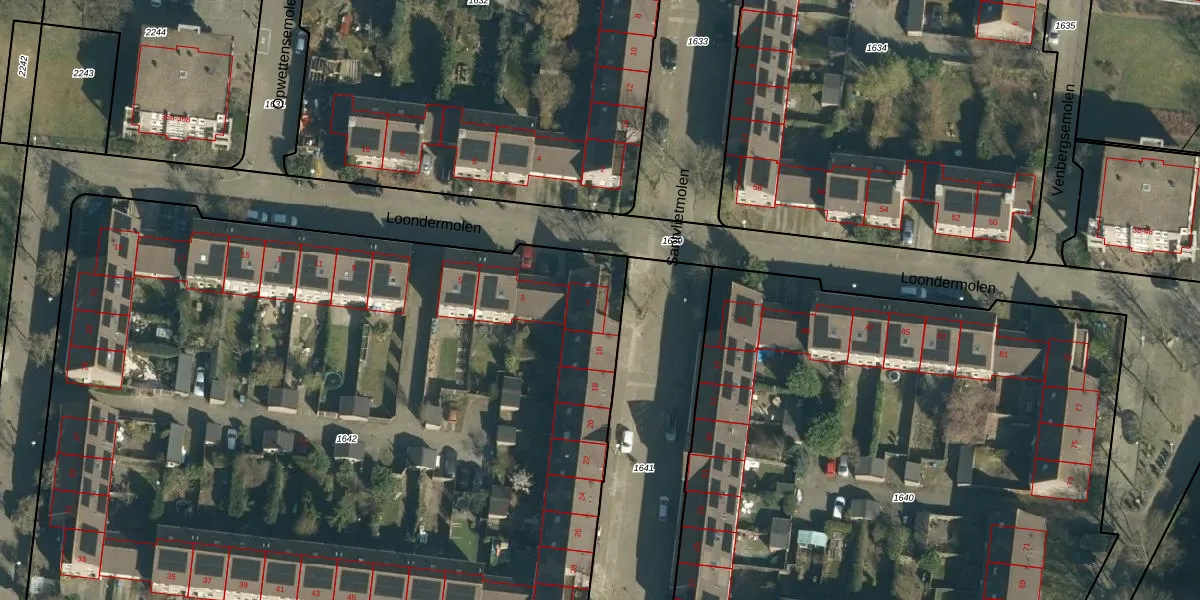 Het perceel waarop Loondermolen 1 staat heeft een oppervlakte van 6280 m². Dit is een zeer groot perceel. De perceeloppervlakte wordt geregistreerd door het Kadaster. Gedetailleerde informatie over de maten van dit perceel kunt u vinden in het rapport Kadastrale kaart met maatvoering van Loondermolen 1.
