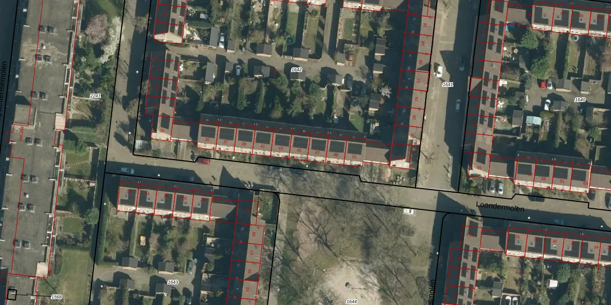Het perceel waarop Loondermolen 45 staat heeft een oppervlakte van 6280 m². Dit is een zeer groot perceel. De perceeloppervlakte wordt geregistreerd door het Kadaster. Gedetailleerde informatie over de maten van dit perceel kunt u vinden in het rapport Kadastrale kaart met maatvoering van Loondermolen 45.