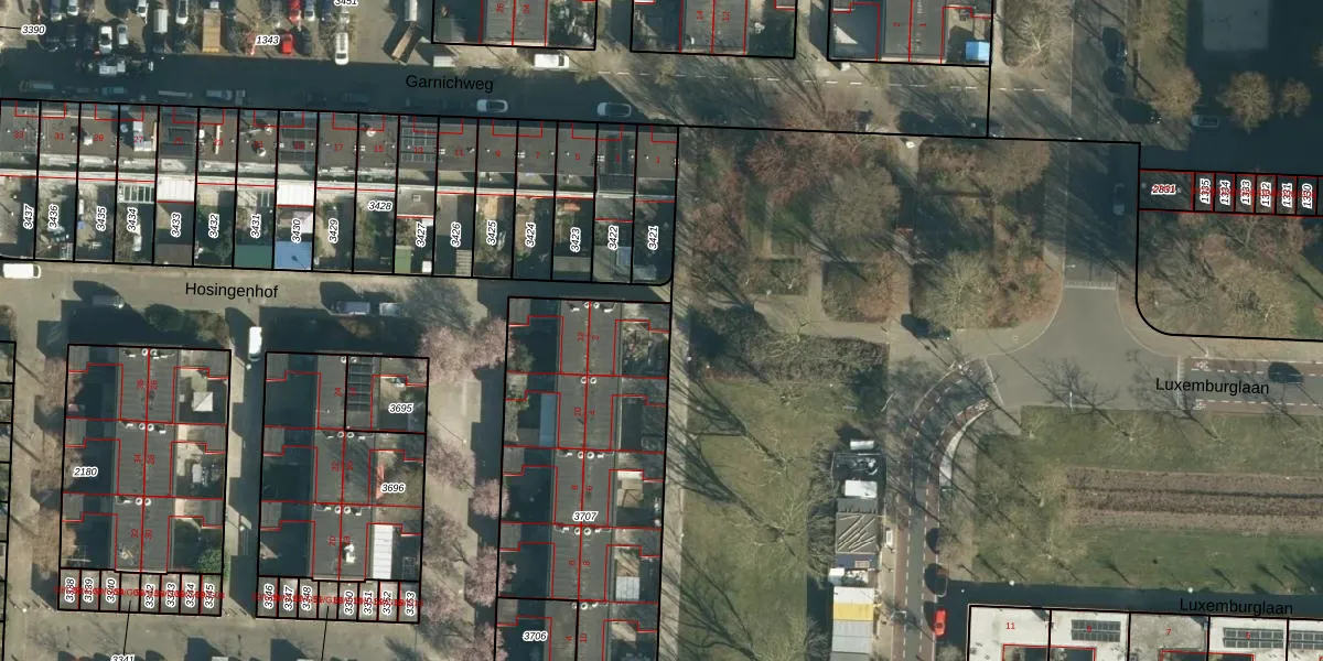 Het perceel waarop Luxemburglaan 2 staat heeft een oppervlakte van 1542 m². Dit is een zeer groot perceel. De perceeloppervlakte wordt geregistreerd door het Kadaster. Gedetailleerde informatie over de maten van dit perceel kunt u vinden in het rapport Kadastrale kaart met maatvoering van Luxemburglaan 2.