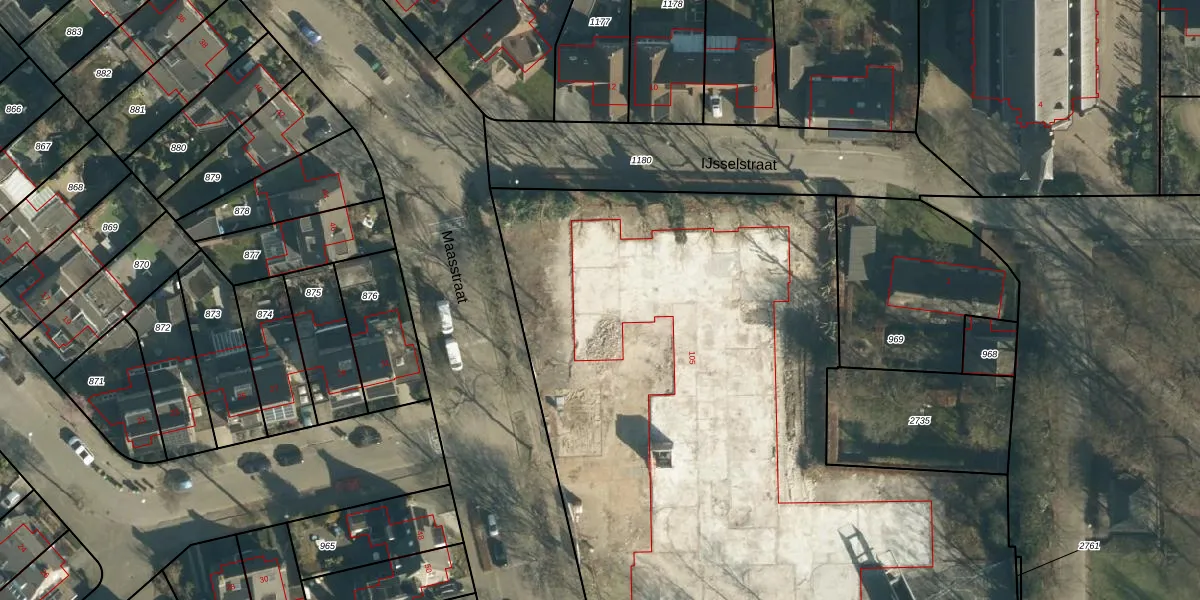 Het perceel waarop Maasstraat 105 staat heeft een oppervlakte van 5247 m². Dit is een zeer groot perceel. De perceeloppervlakte wordt geregistreerd door het Kadaster. Gedetailleerde informatie over de maten van dit perceel kunt u vinden in het rapport Kadastrale kaart met maatvoering van Maasstraat 105.
