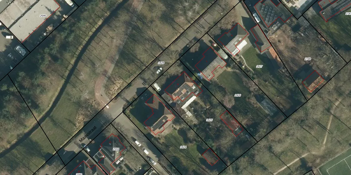 Het perceel waarop Maasstraat 9 staat heeft een oppervlakte van 1423 m². Dit is een zeer groot perceel. De perceeloppervlakte wordt geregistreerd door het Kadaster. Gedetailleerde informatie over de maten van dit perceel kunt u vinden in het rapport Kadastrale kaart met maatvoering van Maasstraat 9.