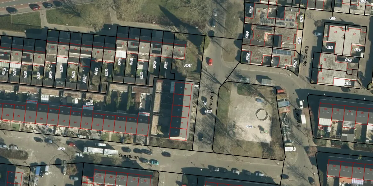 Het perceel waarop Maisweg 9 staat heeft een oppervlakte van 3603 m². Dit is een zeer groot perceel. De perceeloppervlakte wordt geregistreerd door het Kadaster. Gedetailleerde informatie over de maten van dit perceel kunt u vinden in het rapport Kadastrale kaart met maatvoering van Maisweg 9.