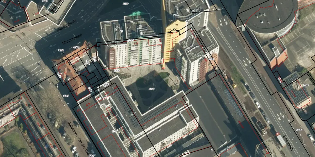 Marconilaan 15-27 is gelegen op kadastraal perceel WSL01G8755. Deze kadastrale aanduiding is uniek en wordt gebruikt door het Kadaster om eigendomsrechten en andere zakelijke rechten vast te leggen. Het perceel maakt onderdeel uit van de kadastrale gemeente Woensel.