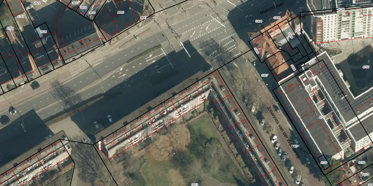 Het perceel waarop Marconilaan 25 staat heeft een oppervlakte van 7403 m². Dit is een zeer groot perceel. De perceeloppervlakte wordt geregistreerd door het Kadaster. Gedetailleerde informatie over de maten van dit perceel kunt u vinden in het rapport Kadastrale kaart met maatvoering van Marconilaan 25.