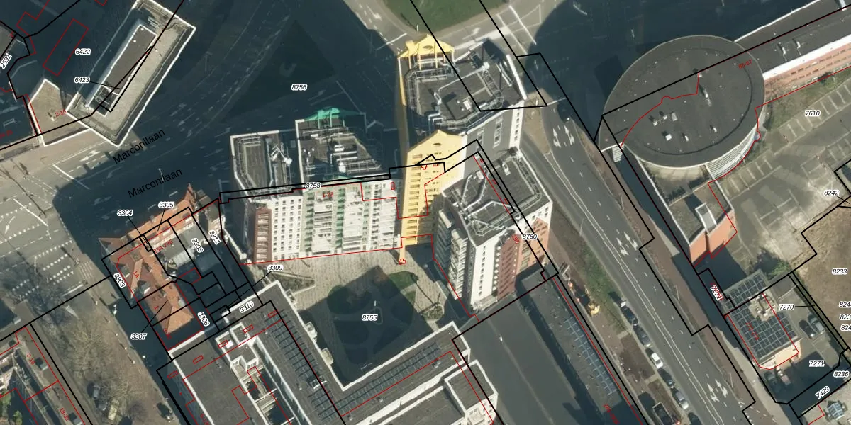 Marconilaan 3-10 is gelegen op kadastraal perceel WSL01G8755. Deze kadastrale aanduiding is uniek en wordt gebruikt door het Kadaster om eigendomsrechten en andere zakelijke rechten vast te leggen. Het perceel maakt onderdeel uit van de kadastrale gemeente Woensel.