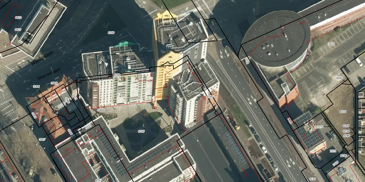 Marconilaan 3-25 is gelegen op kadastraal perceel WSL01G8755. Deze kadastrale aanduiding is uniek en wordt gebruikt door het Kadaster om eigendomsrechten en andere zakelijke rechten vast te leggen. Het perceel maakt onderdeel uit van de kadastrale gemeente Woensel.