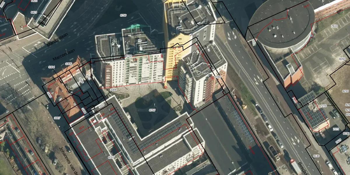 Het perceel waarop Marconilaan 5-05 staat heeft een oppervlakte van 3740 m². Dit is een zeer groot perceel. De perceeloppervlakte wordt geregistreerd door het Kadaster. Gedetailleerde informatie over de maten van dit perceel kunt u vinden in het rapport Kadastrale kaart met maatvoering van Marconilaan 5-05.