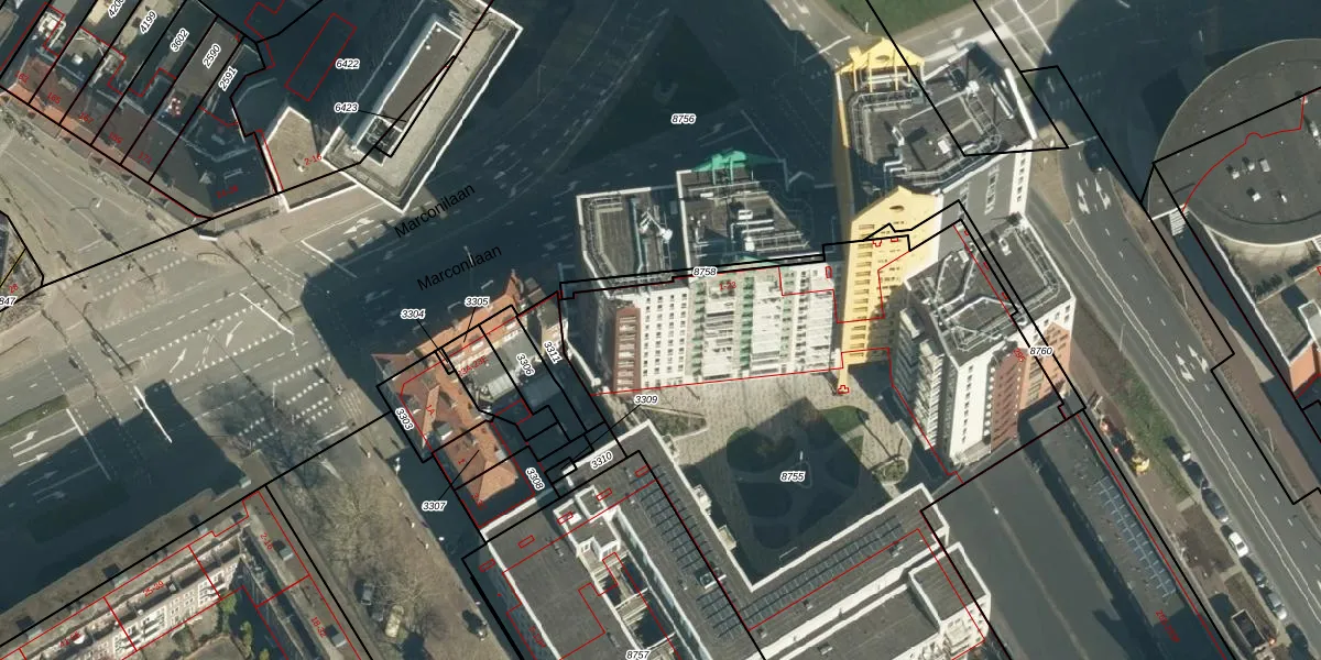 Marconilaan 5-14 is gelegen op kadastraal perceel WSL01G8755. Deze kadastrale aanduiding is uniek en wordt gebruikt door het Kadaster om eigendomsrechten en andere zakelijke rechten vast te leggen. Het perceel maakt onderdeel uit van de kadastrale gemeente Woensel.