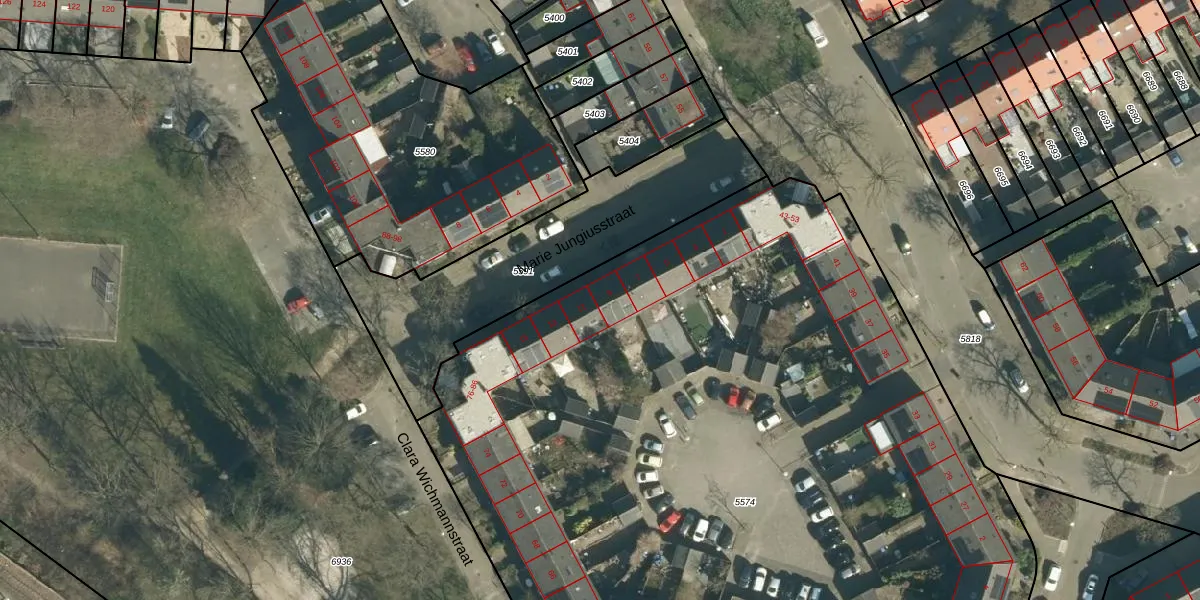 Het perceel waarop Marie Jungiusstraat 9 staat heeft een oppervlakte van 6989 m². Dit is een zeer groot perceel. De perceeloppervlakte wordt geregistreerd door het Kadaster. Gedetailleerde informatie over de maten van dit perceel kunt u vinden in het rapport Kadastrale kaart met maatvoering van Marie Jungiusstraat 9.