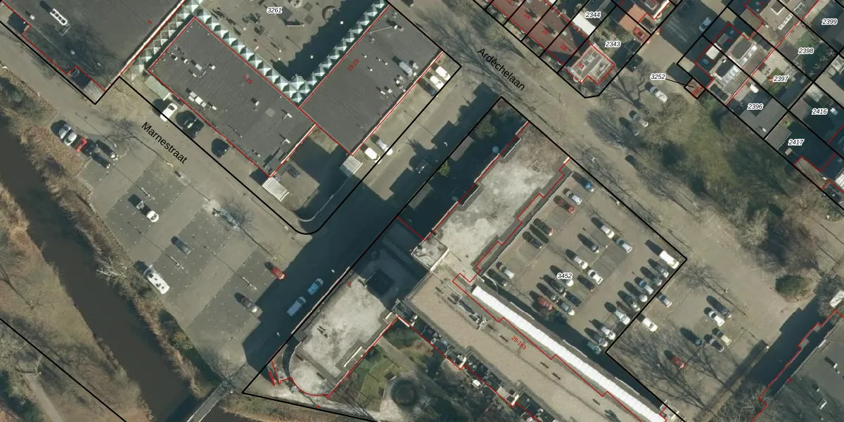 Het perceel waarop Marnestraat 216 staat heeft een oppervlakte van 5176 m². Dit is een zeer groot perceel. De perceeloppervlakte wordt geregistreerd door het Kadaster. Gedetailleerde informatie over de maten van dit perceel kunt u vinden in het rapport Kadastrale kaart met maatvoering van Marnestraat 216.