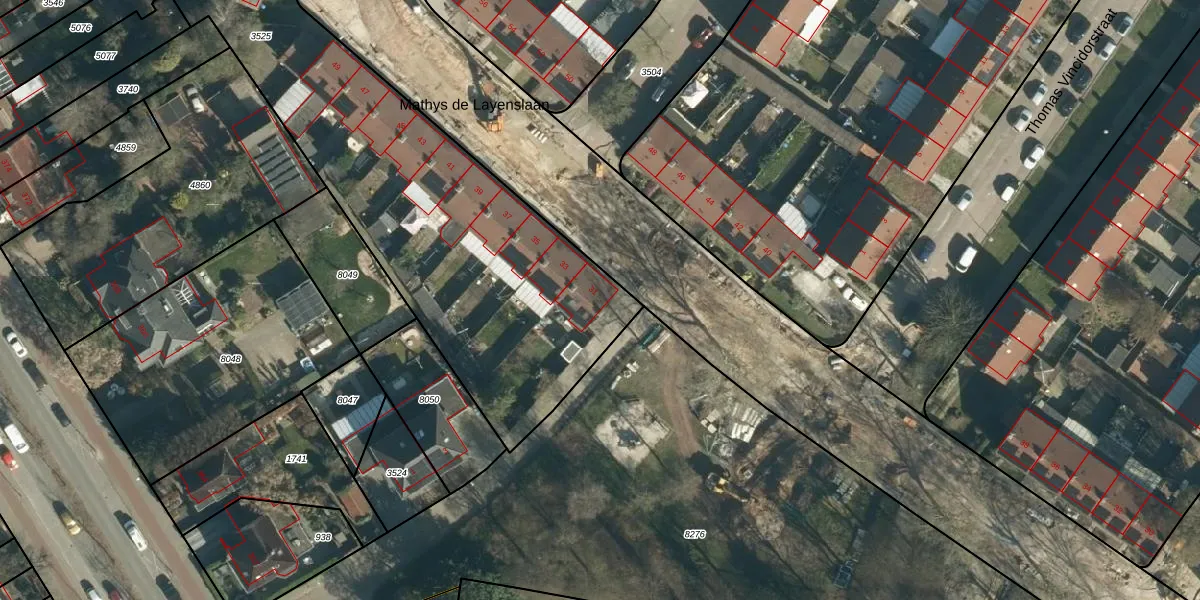 Het perceel waarop Mathys de Layenslaan 31 staat heeft een oppervlakte van 3341 m². Dit is een zeer groot perceel. De perceeloppervlakte wordt geregistreerd door het Kadaster. Gedetailleerde informatie over de maten van dit perceel kunt u vinden in het rapport Kadastrale kaart met maatvoering van Mathys de Layenslaan 31.