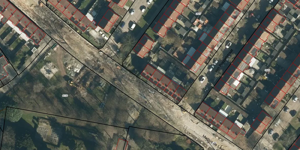 Het perceel waarop Mathys de Layenslaan 38 staat heeft een oppervlakte van 4950 m². Dit is een zeer groot perceel. De perceeloppervlakte wordt geregistreerd door het Kadaster. Gedetailleerde informatie over de maten van dit perceel kunt u vinden in het rapport Kadastrale kaart met maatvoering van Mathys de Layenslaan 38.