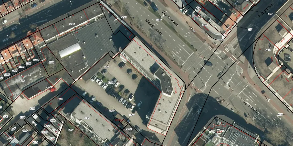 Het perceel waarop Mauritsstraat 176 staat heeft een oppervlakte van 3137 m². Dit is een zeer groot perceel. De perceeloppervlakte wordt geregistreerd door het Kadaster. Gedetailleerde informatie over de maten van dit perceel kunt u vinden in het rapport Kadastrale kaart met maatvoering van Mauritsstraat 176.