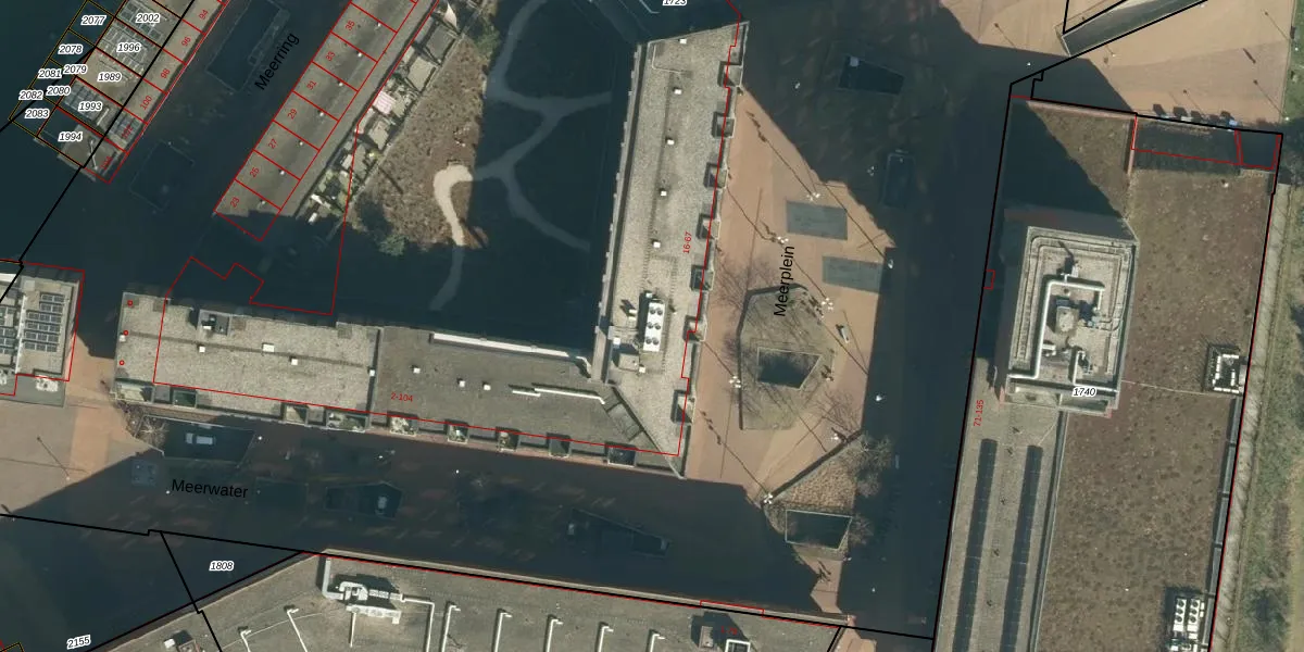Het perceel waarop Meerplein 24 staat heeft een oppervlakte van 2,5 ha. Dit is een zeer groot perceel. De perceeloppervlakte wordt geregistreerd door het Kadaster. Gedetailleerde informatie over de maten van dit perceel kunt u vinden in het rapport Kadastrale kaart met maatvoering van Meerplein 24.