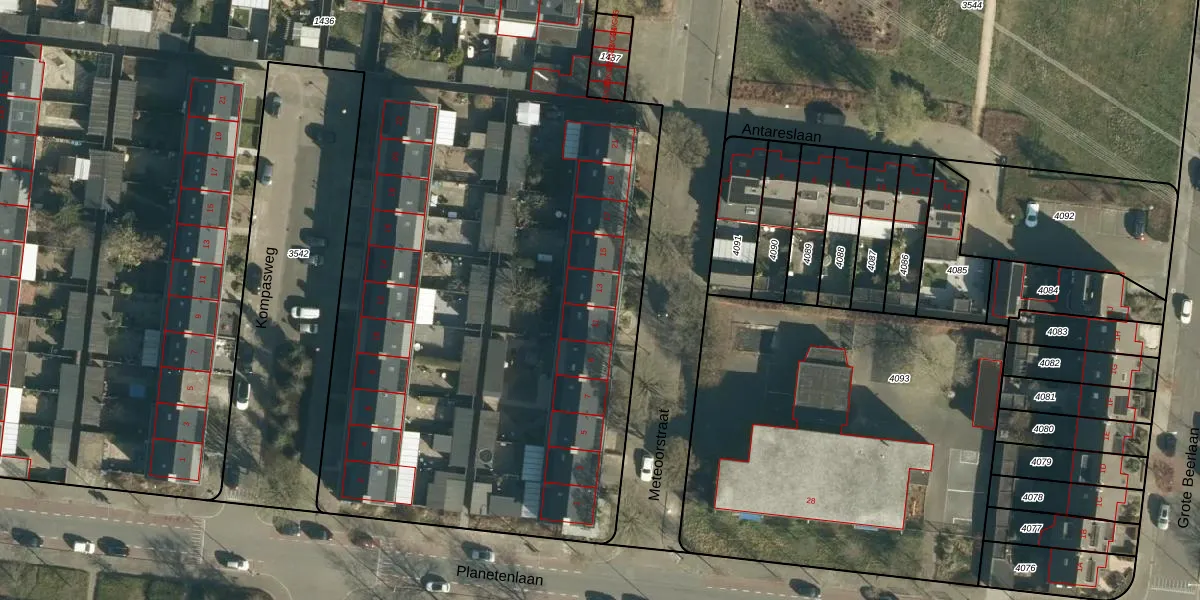Het perceel waarop Meteoorstraat 13 staat heeft een oppervlakte van 1,0 ha. Dit is een zeer groot perceel. De perceeloppervlakte wordt geregistreerd door het Kadaster. Gedetailleerde informatie over de maten van dit perceel kunt u vinden in het rapport Kadastrale kaart met maatvoering van Meteoorstraat 13.