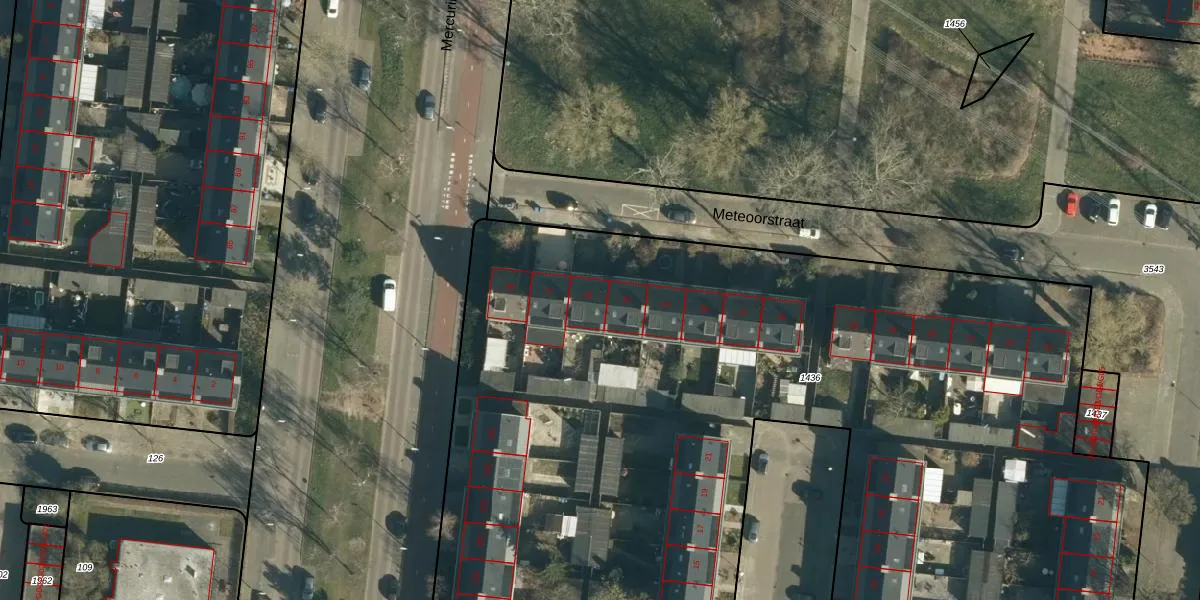 Het perceel waarop Meteoorstraat 45 staat heeft een oppervlakte van 1,0 ha. Dit is een zeer groot perceel. De perceeloppervlakte wordt geregistreerd door het Kadaster. Gedetailleerde informatie over de maten van dit perceel kunt u vinden in het rapport Kadastrale kaart met maatvoering van Meteoorstraat 45.