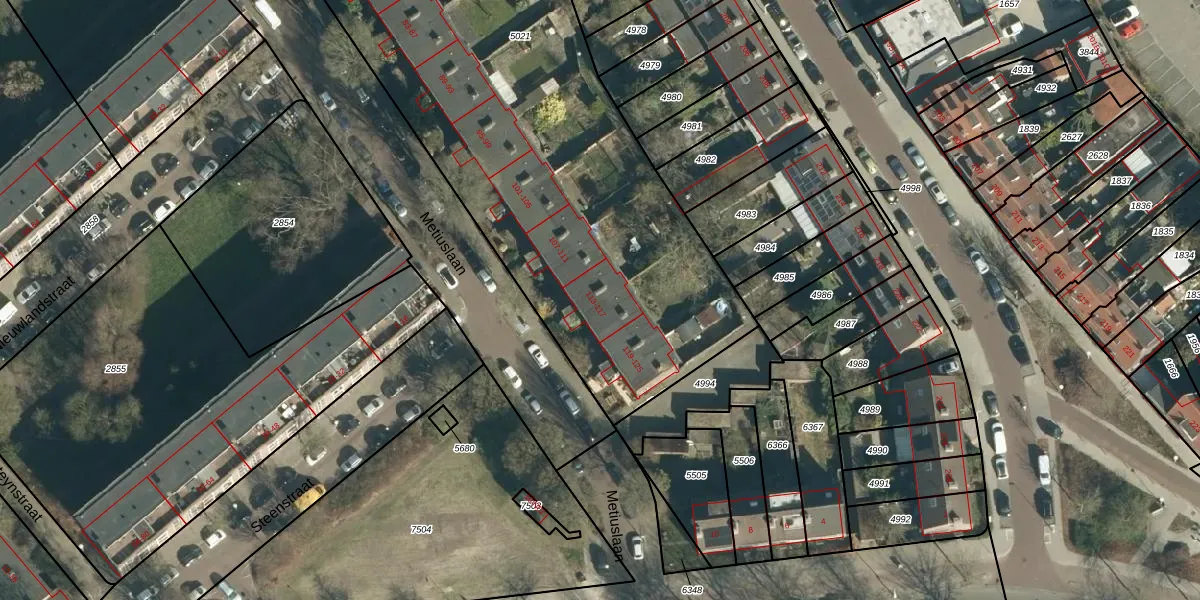 Het perceel waarop Metiuslaan 115 staat heeft een oppervlakte van 4093 m². Dit is een zeer groot perceel. De perceeloppervlakte wordt geregistreerd door het Kadaster. Gedetailleerde informatie over de maten van dit perceel kunt u vinden in het rapport Kadastrale kaart met maatvoering van Metiuslaan 115.