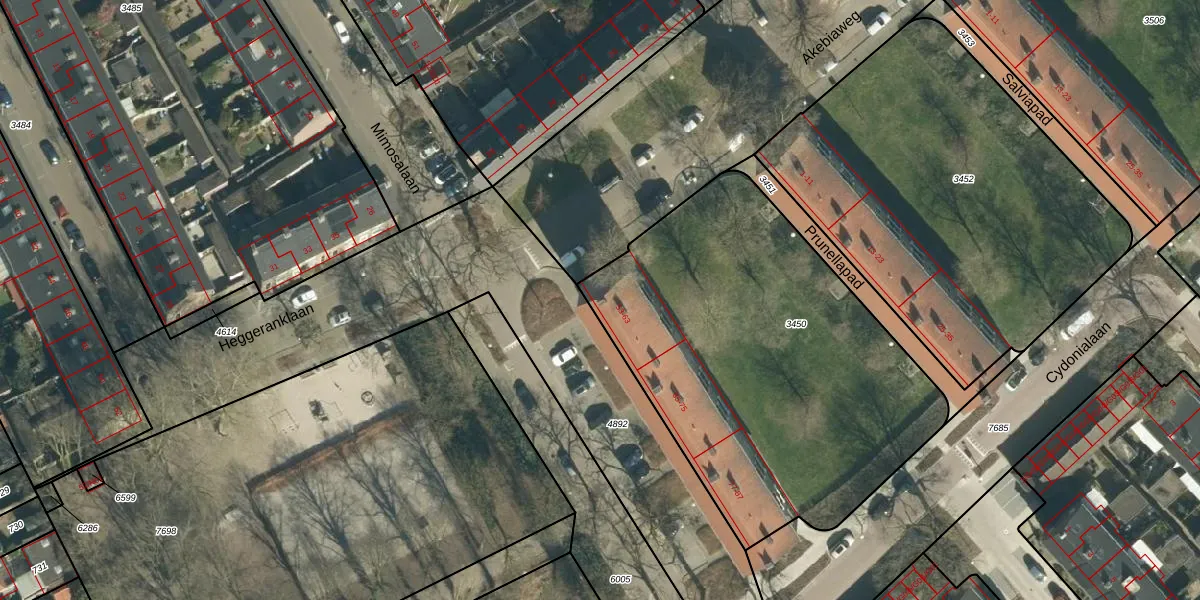 Het perceel waarop Mimosalaan 53 staat heeft een oppervlakte van 2120 m². Dit is een zeer groot perceel. De perceeloppervlakte wordt geregistreerd door het Kadaster. Gedetailleerde informatie over de maten van dit perceel kunt u vinden in het rapport Kadastrale kaart met maatvoering van Mimosalaan 53.