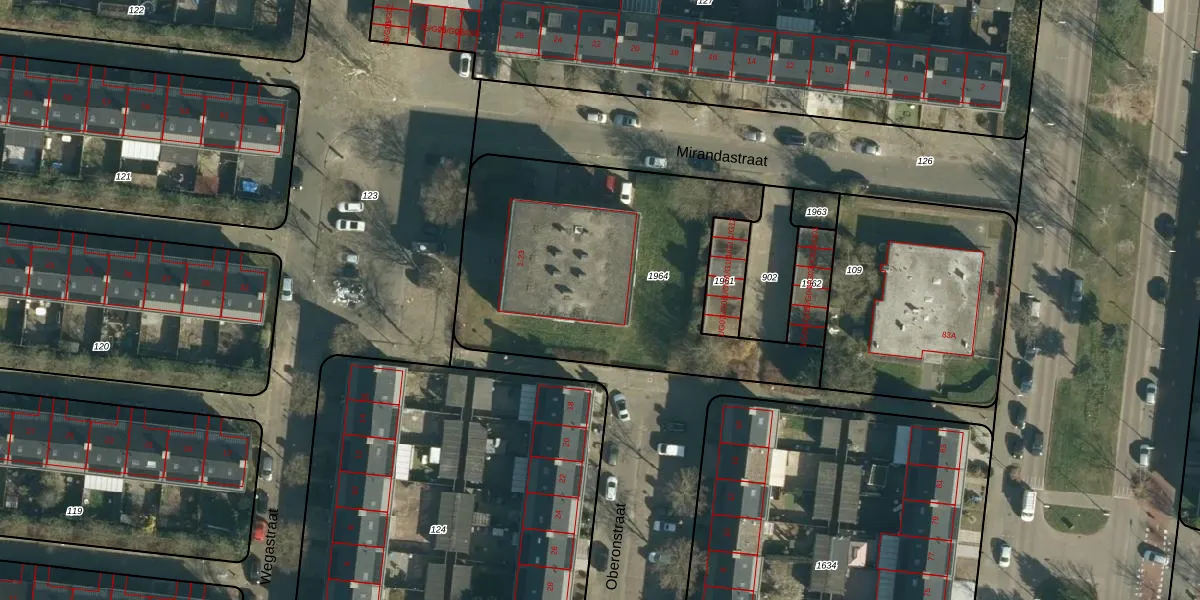 Het perceel waarop Mirandastraat 23 staat heeft een oppervlakte van 1550 m². Dit is een zeer groot perceel. De perceeloppervlakte wordt geregistreerd door het Kadaster. Gedetailleerde informatie over de maten van dit perceel kunt u vinden in het rapport Kadastrale kaart met maatvoering van Mirandastraat 23.